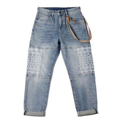 Vintage Distressed Men's Jeans, Loose Straight Fit with Geometric Pattern Panels, Trendy and Stylish for Fashionable Men