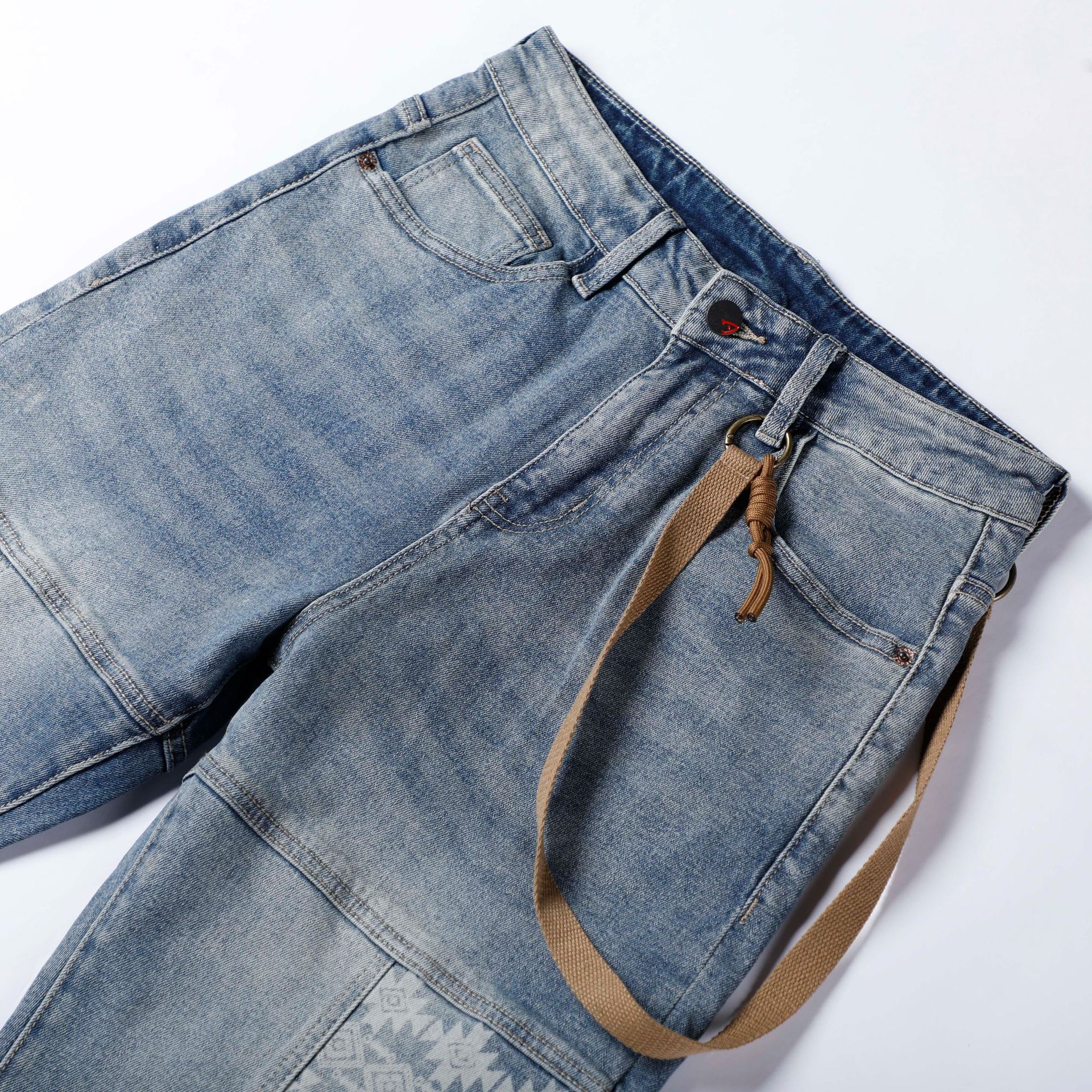Vintage Distressed Men's Jeans, Loose Straight Fit with Geometric Pattern Panels, Trendy and Stylish for Fashionable Men